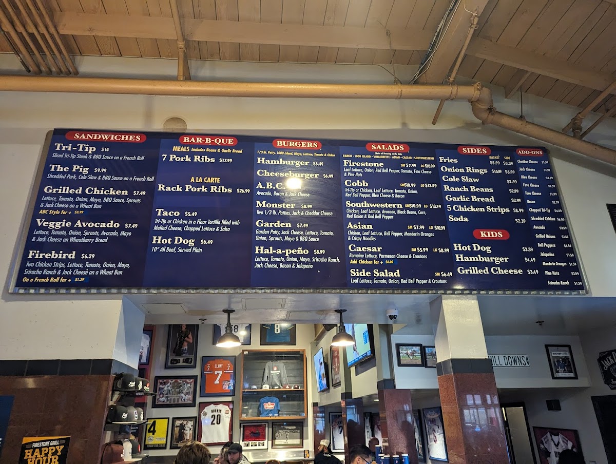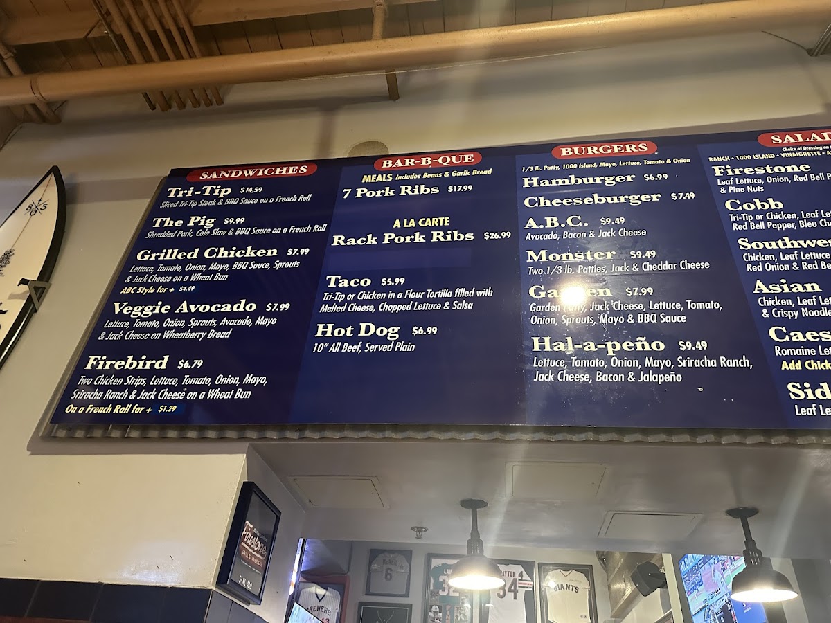 BBQ chicken breast, lettuce, tomato, onion, sprouts, mayo, BBQ sauce, & Jack cheese on a wheat bun.